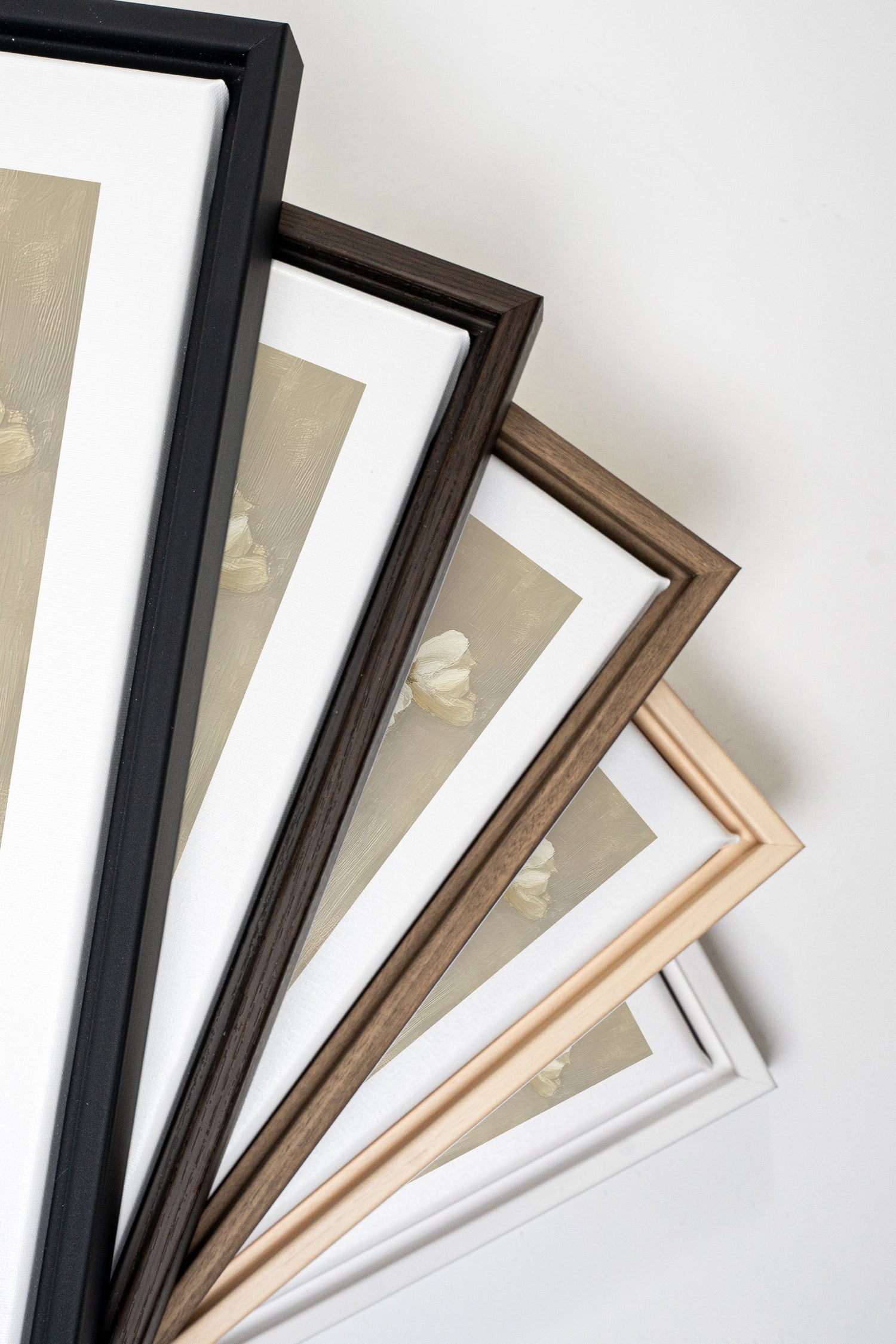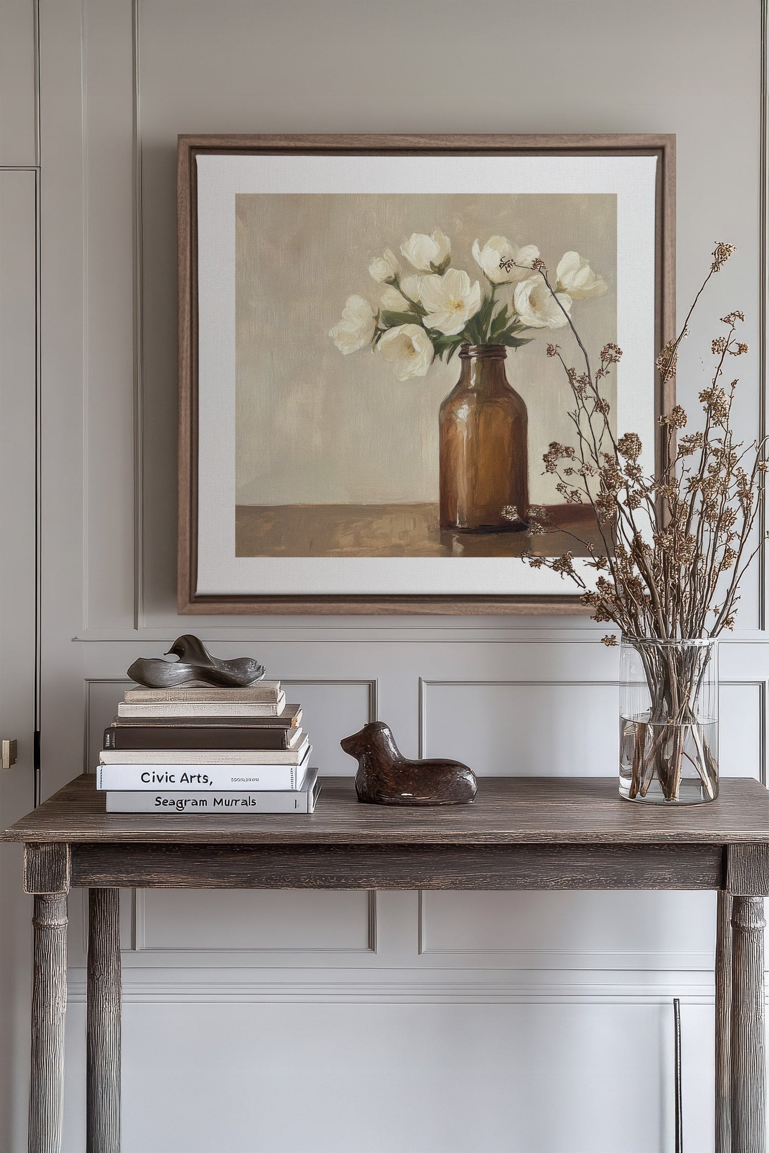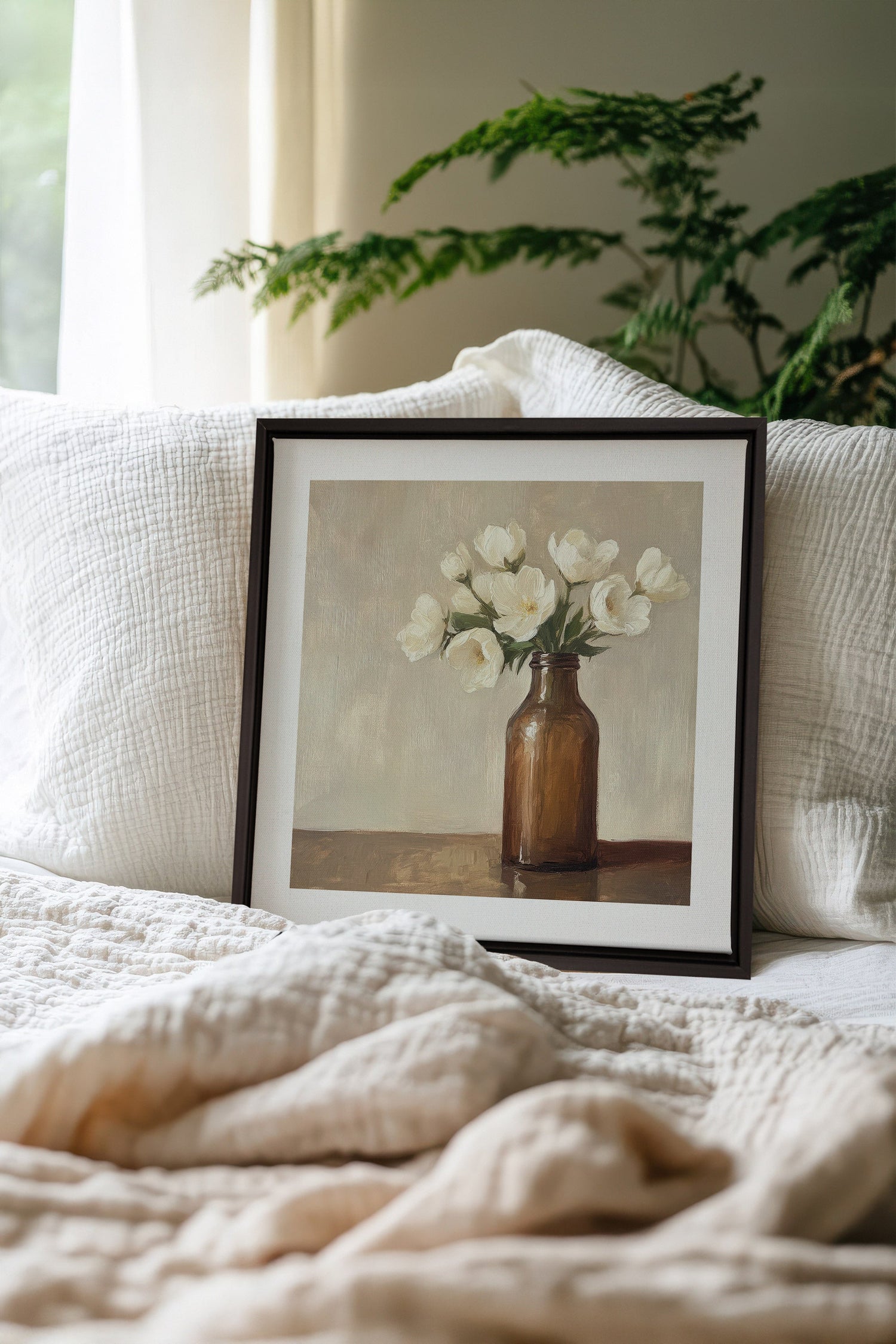 This delicate still life depicts a bouquet of white flowers in an antique brown vase. Its textured beige background and natural palette create a soothing and nostalgic atmosphere. This work captures the beauty of the passing of time with elegance and understatement. It's perfect for a vintage or rustic chic interior. A soft and timeless piece, imbued with calm and delicacy.