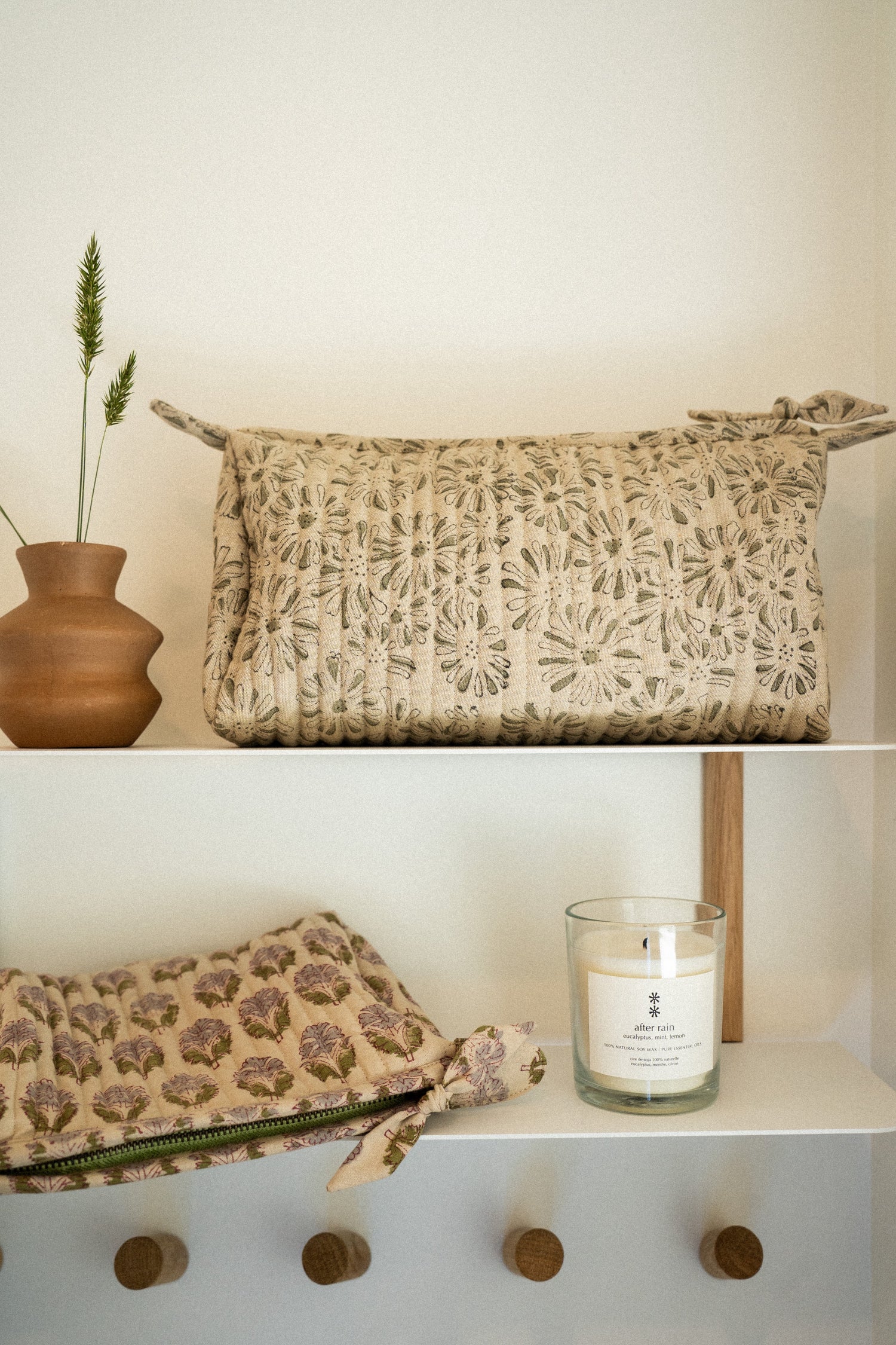 Add soft sophistication to your accessories with the Kalyani Block Print Pouch. Hand block printed in India using traditional crafting methods, this small quilted clutch features a ditsy floral pattern in soft green tones on a warm neutral base. The padded cotton exterior offers a comfortable feel in hand, while the interior reveals a contrasting striped lining that adds a playful surprise. Finished with a durable YKK zipper and matching fabric tie, it’s perfect for storing makeup, organizing your tote, or carrying the essentials as a minimalist clutch.