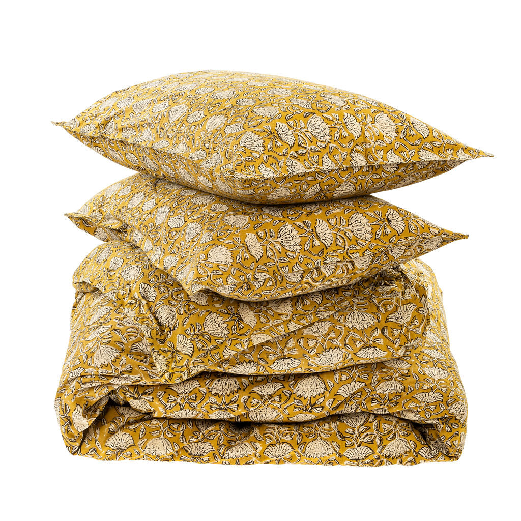 Transform your bedroom with the Manu Block Print Queen Duvet Set, a luxurious addition to your bedding collection. Featuring deep golden hues and a hand-block-printed botanical pattern, this duvet set combines artisanal craftsmanship with timeless beauty. Made from 100% organic cotton, it offers unmatched softness and breathability, ensuring a restful night's sleep. Coconut shell buttons add an eco-friendly and elegant finishing touch.