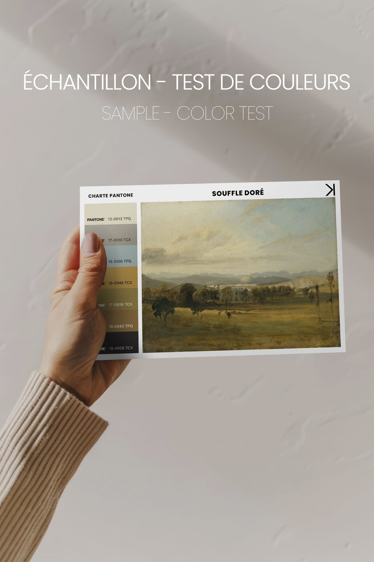 A landscape gilded by the raking light, inhabited by a few peaceful animals. The background reveals an old building, like a discreet witness to the past. The whole image inspires peace, warmth, and the simplicity of slow days. Ideal for warming up a natural interior.