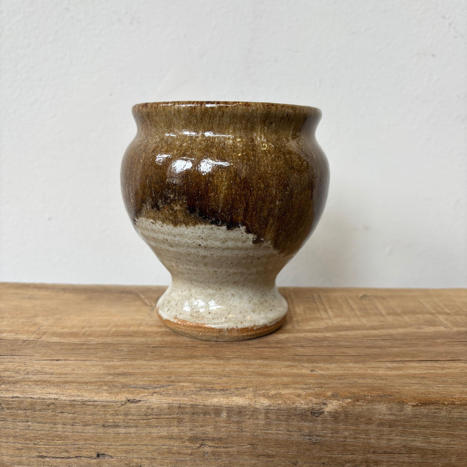 This piece features a distinctive dripping glaze, making this small footed pot truly one of a kind. The warm green and brown tones blend beautifully with cream accents, creating an earthy, artisanal aesthetic. Perfect for displaying small plants, holding trinkets, or adding character to a shelf.
